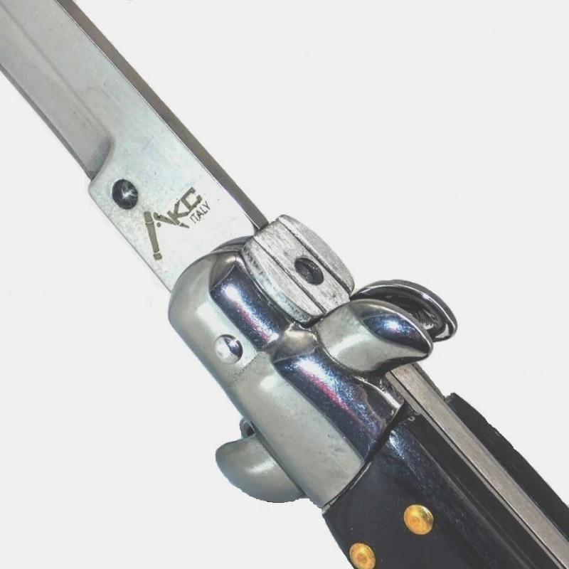 The AKC swing guard stiletto with bayonet blade is a handsome piece to add to any collection. The satin finished, stainless steel bayonet blade is the standard for this style. The black ABS handles are sleek and give the knife a a classic look. The polished bolsters and buttons add shine. The push button release is quick and the lock up is secure. This knife includes a sliding safety to protect against accidental release of the blade. If you’re just getting into the Italian knives, this is a great way to start your collection.