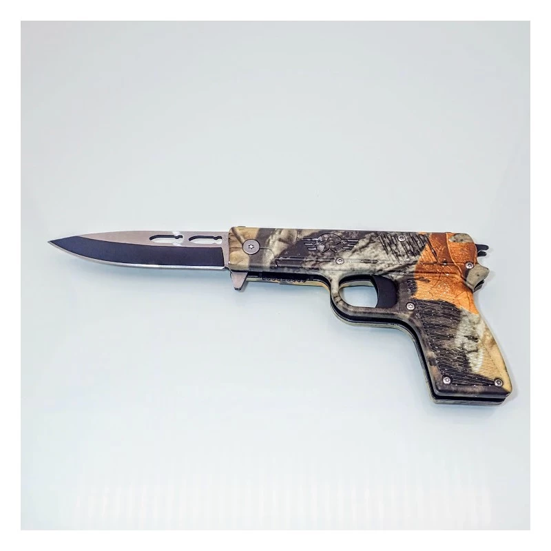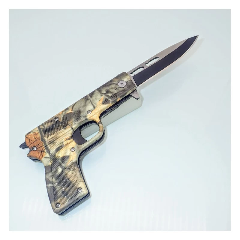 Styled like a conventional handgun, this item is actually a knife with a 8,5cm drop point blade. The blade is made from high quality stainless steel. Overall Length: 21cm (with blade deployed), 12cm (closed) Blade: Stainless steel Blade Length: 8,5cm Blade Width: 1,9cm Blade Thickness: 0,3cm Handle Length: 8cm
