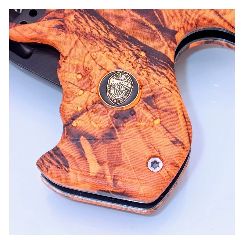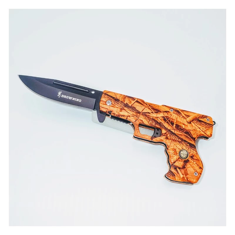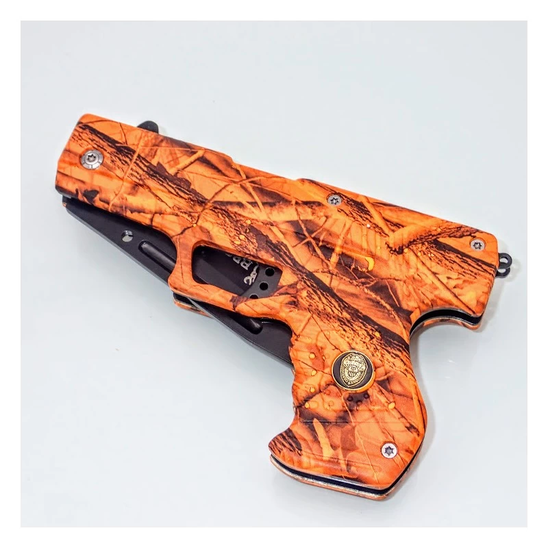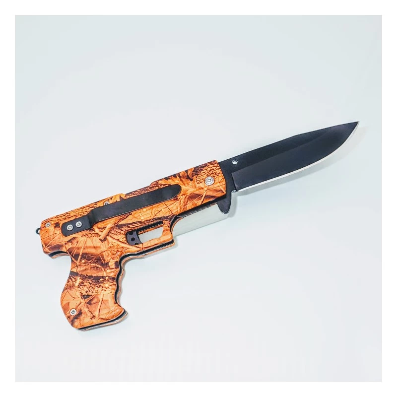 Styled like a conventional handgun, this item is actually a knife with a 9 cm drop point blade. The blade is made from high quality stainless steel. Overall Length: 21cm (with blade deployed), 12 cm (closed) Blade: Stainless steel Blade Length: 9 cm Blade Width: 1,9 cm Blade Thickness: 0,3 cm Handle Length: 9 cm