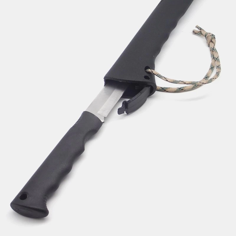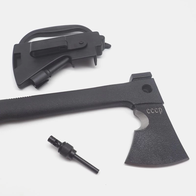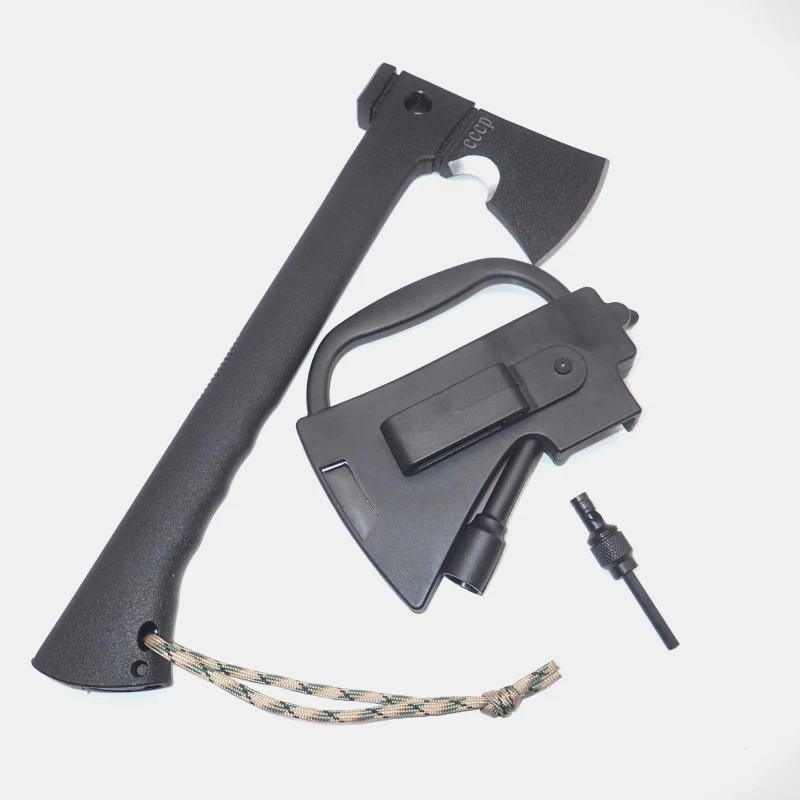 The ax comes with a knife, a whistle, a flint and a sheath made of durable plastic with a loop for wearing on a belt.