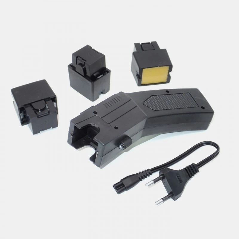 Packing includes: Stun Gun, Charger, 3 x Cartridges, Laser Sight, , LED Flashlight, Siren, Nylon Holder, Stylish Black Bag