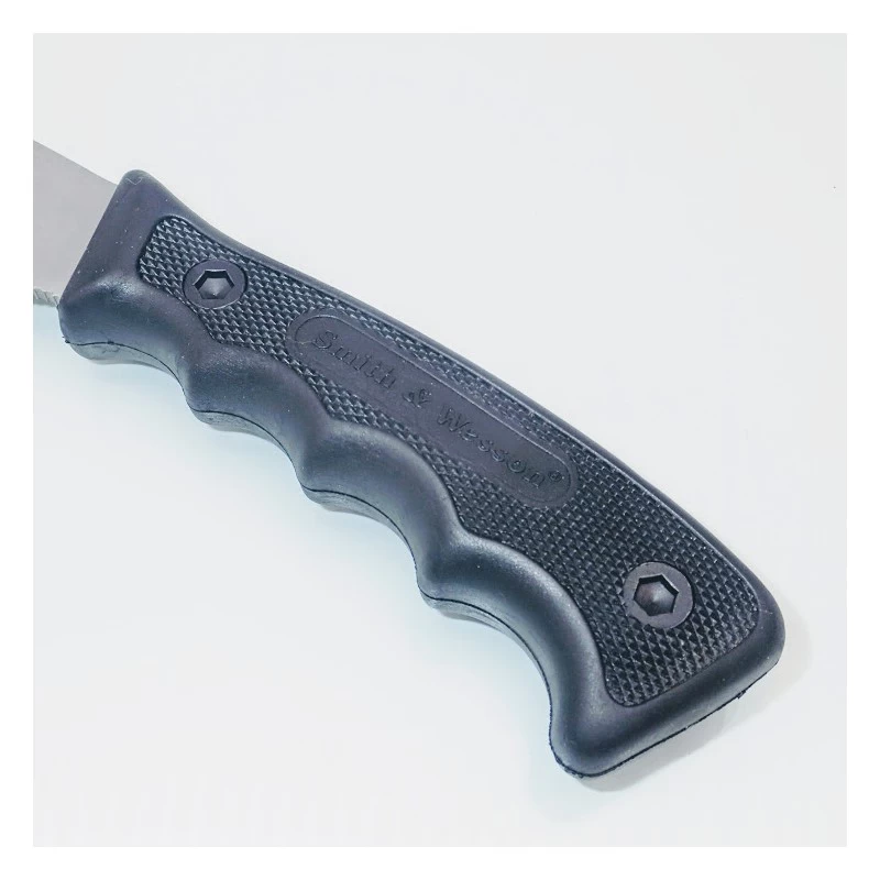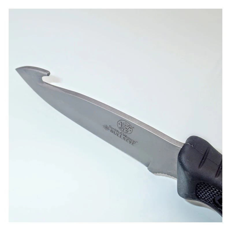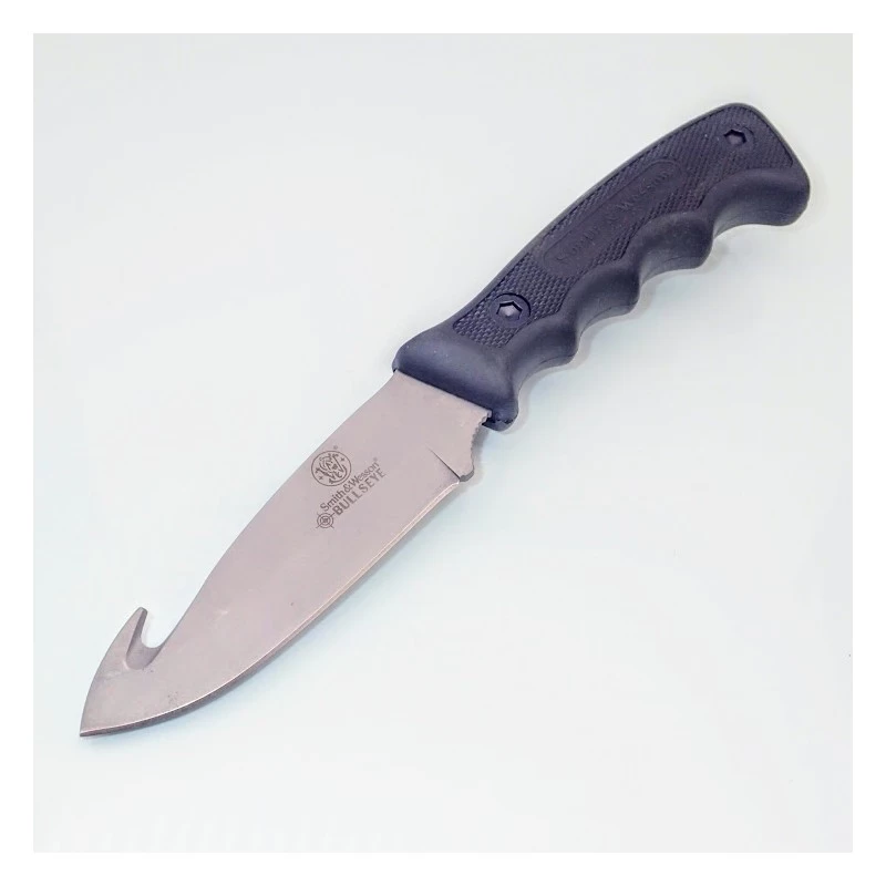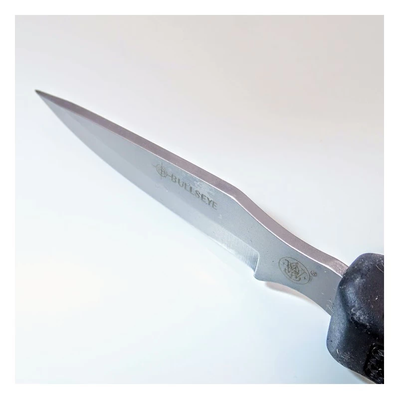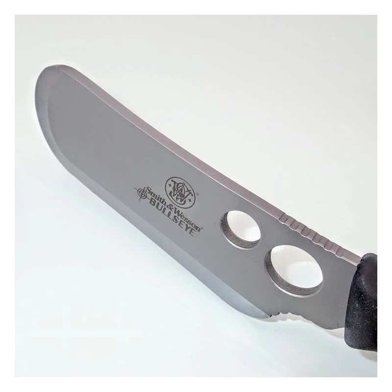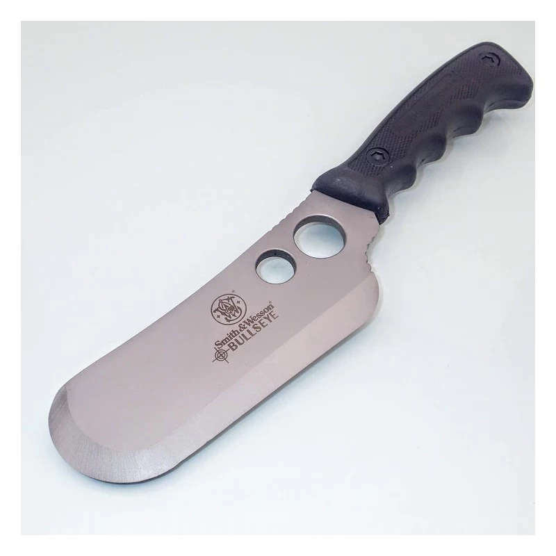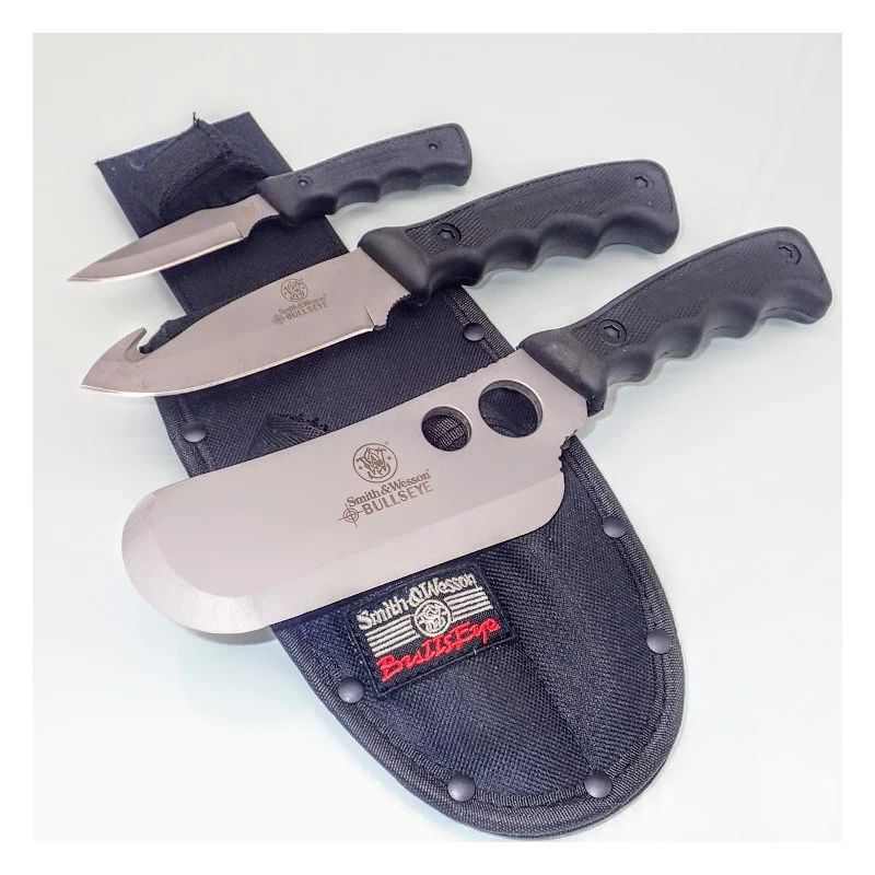Carry every blade needed for a weekend in the woods with the Smith & Wesson SWCAMP Bull’s Eye Campfire Knife Set. The three tool set features cleaver, guthook and caper knives to provide all wilderness essentials to clean and cook fresh caught game. The girth of the cleaver slices through large hunks of meat with ease, while the reinforced guthook cleans and dresses animals effortlessly. The classic caper knife tis designed to skin game with ultimate precision, leaving nothing to waste. Each blade is forged from genuine, stainless steel and features a full-tang construction to ensure long lasting service life without breaks, cracks or corrosion. Rubberized handles offer a secure grip regardless of weather conditions or wet hands. The kit includes a convenient, nylon belt sheath that comfortably holds all three knives for convenient storage and portability.